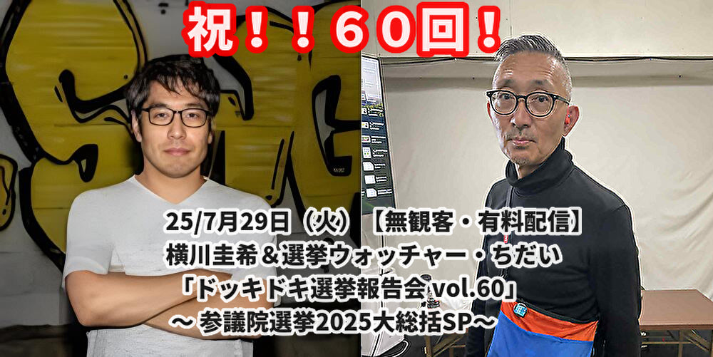 25/7月29日(火)【無観客・有料配信】 横川圭希&選挙ウォッチャー・ちだい 「ドッキドキ選挙報告会 vol.60」 ~ 参議院選挙2025大総括SP~