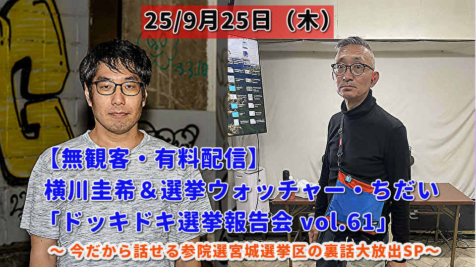 25/9月25日(木)【無観客・有料配信】 横川圭希&選挙ウォッチャー・ちだい 「ドッキドキ選挙報告会 vol.61」 ~ 今だから話せる参院選宮城選挙区の裏話大放出SP~